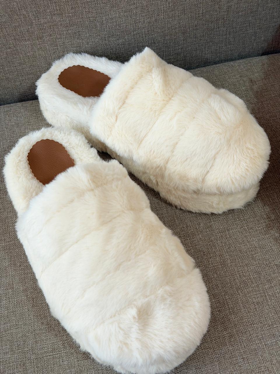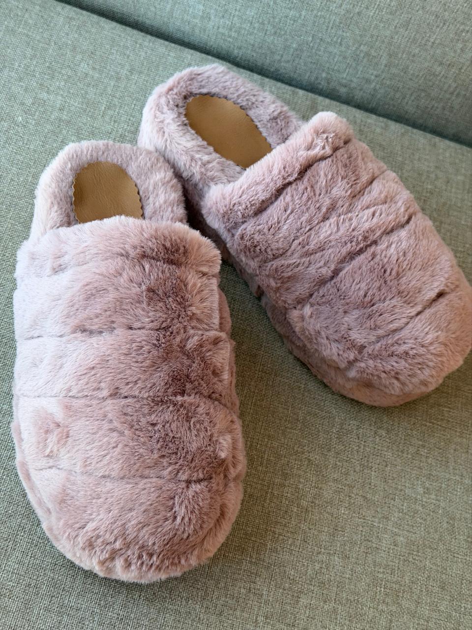 Pantuflas símil piel de conejo super suaves. No son de peluche . Base de goma eva de 24 mm forrada con la piel. Plantilla de cartón con eva también forrada. La faja es totalmente de piel. Van empacadas en una bolsa transparente autoadhesiva